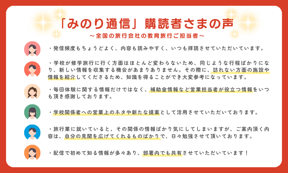 生徒・児童にとってかけがえのない思い出となり、非日常な体験を通じて深い学びや生きる力を得ることができる「教育旅行」を、より”実りある”ものにしたいという想いから、「みのり通信」をはじめました。