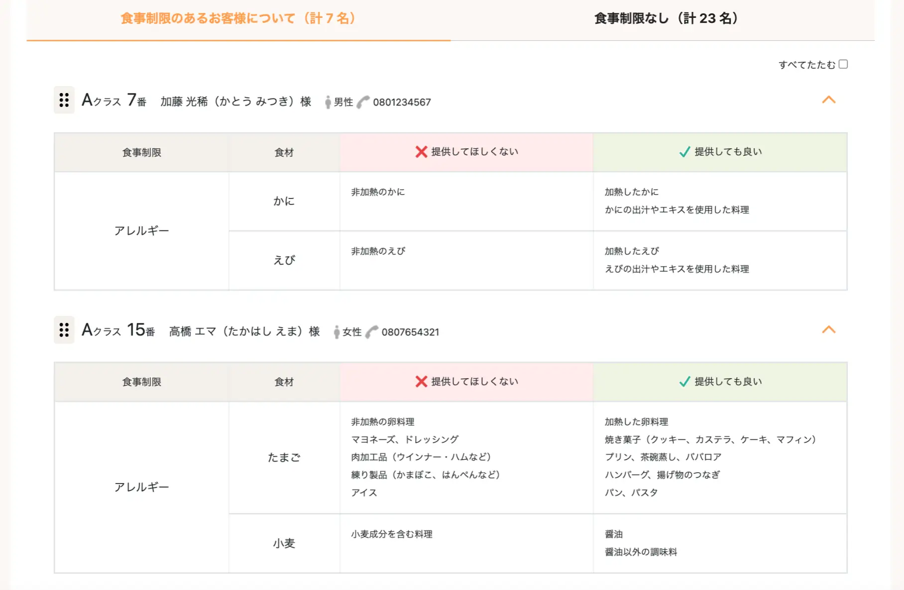 …アレルギー対応を行うホテルや旅館のスタッフは、アレルギー対応が必要な児童・生徒の情報を見やすい一覧で確認できます。