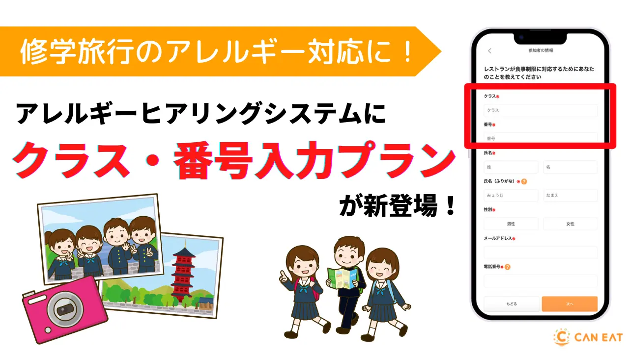 株式会社CAN EAT(本社:東京都新宿区、代表取締役社長:田ヶ原絵里、以下「CAN EAT」)は、QRコードひとつでゲストの正確なアレルギー情報を把握できる「アレルギーヒアリングシステム」において、旅行代理店・宿泊事業者向けの「クラス・番号入力プラン」を新たに提供開始しました。