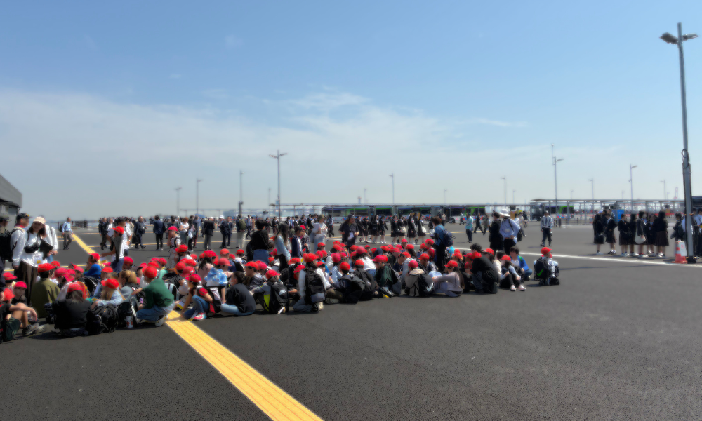 シャトルバスを降りると、上記画像の右方向より貸し切りバスの駐車場から、多くの児童・生徒さんが列になって歩いてこられました。