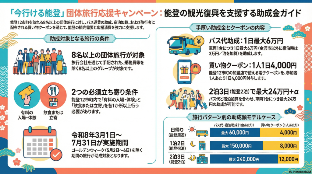• 2泊3日(能登2泊): バス助成合計24万円 + クーポン12,000円/人