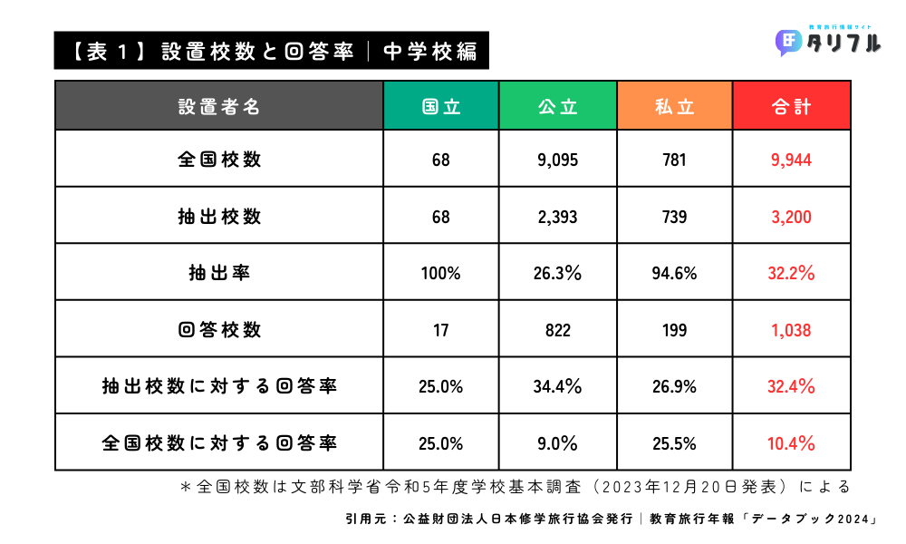 2024年12月1日、公益財団法人日本修学旅行協会より「教育旅行年報データブック 2024」が発行され、2023年度に実施した全国修学旅行調査(中学校・高等学校)が公開されました。