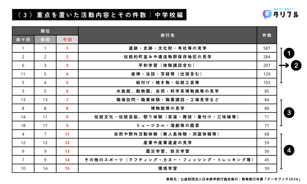 ⇒コロナの5類移行により、感染予防措置のため工場見学や職場訪問を制限していた企業が受入れを再開したことや、ホールや室内での鑑賞の利用規制が緩和されたことにより、順位を上げている。