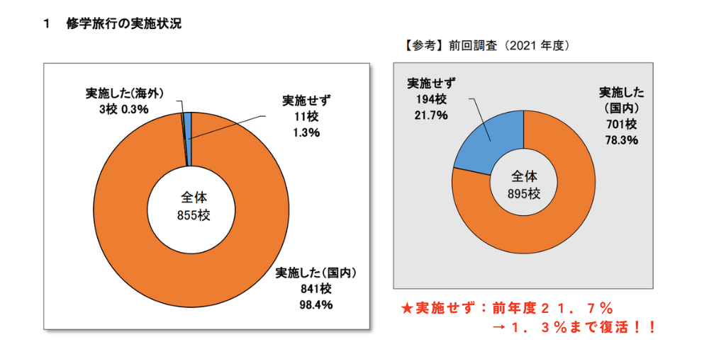 ⇒コロナの影響により中止を余儀なくされた学校もありましたが、今年度の修学旅行の実施率は98.4%と、ほとんどの学校が実施できる状況まで回復しました。