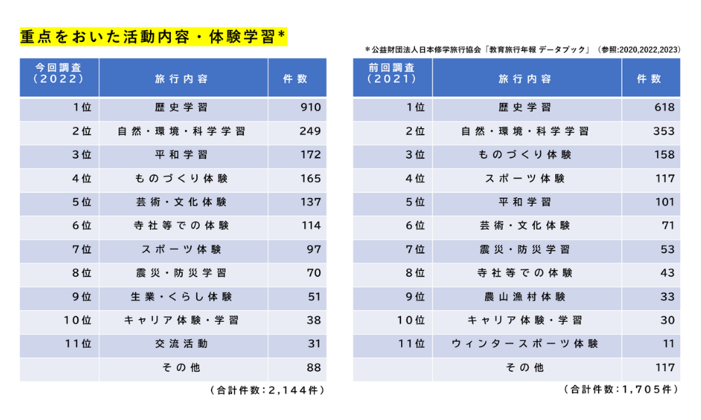 京都・奈良での「歴史学習」が不動の1位であることは言わずもがなですが、「自然・環境・科学学習」「ものづくり体験」も、人気の体験活動として注目されていることがわかります。