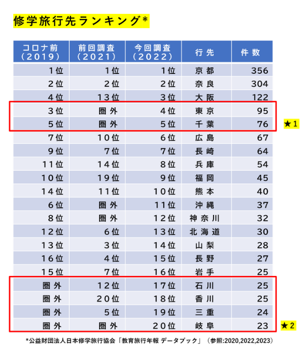 しかしコロナ禍を経て、東京や千葉などの都心、またはディズニーランドへの修学旅行が完全に復活したことがうかがえます。