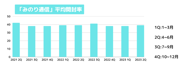 メルマガの平均開封率は約15~20%(※)と言われていますが、「みのり通信」は配信開始から変わらず約40%を維持し続けています。