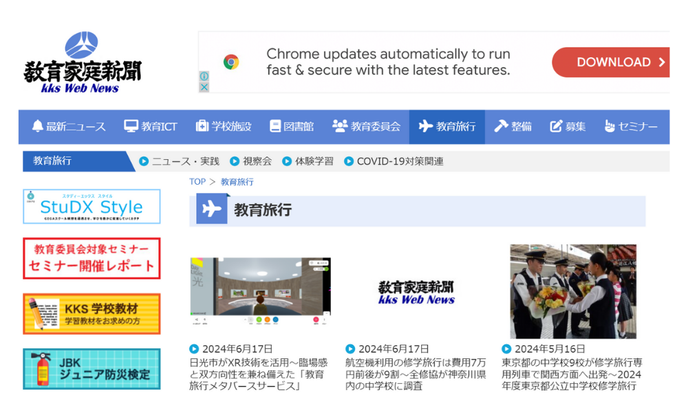 電子版「NIKKYOWEB」では、修学旅行に関する調査まとめやトレンドの学習テーマのご紹介が勉強になります!